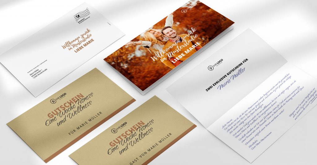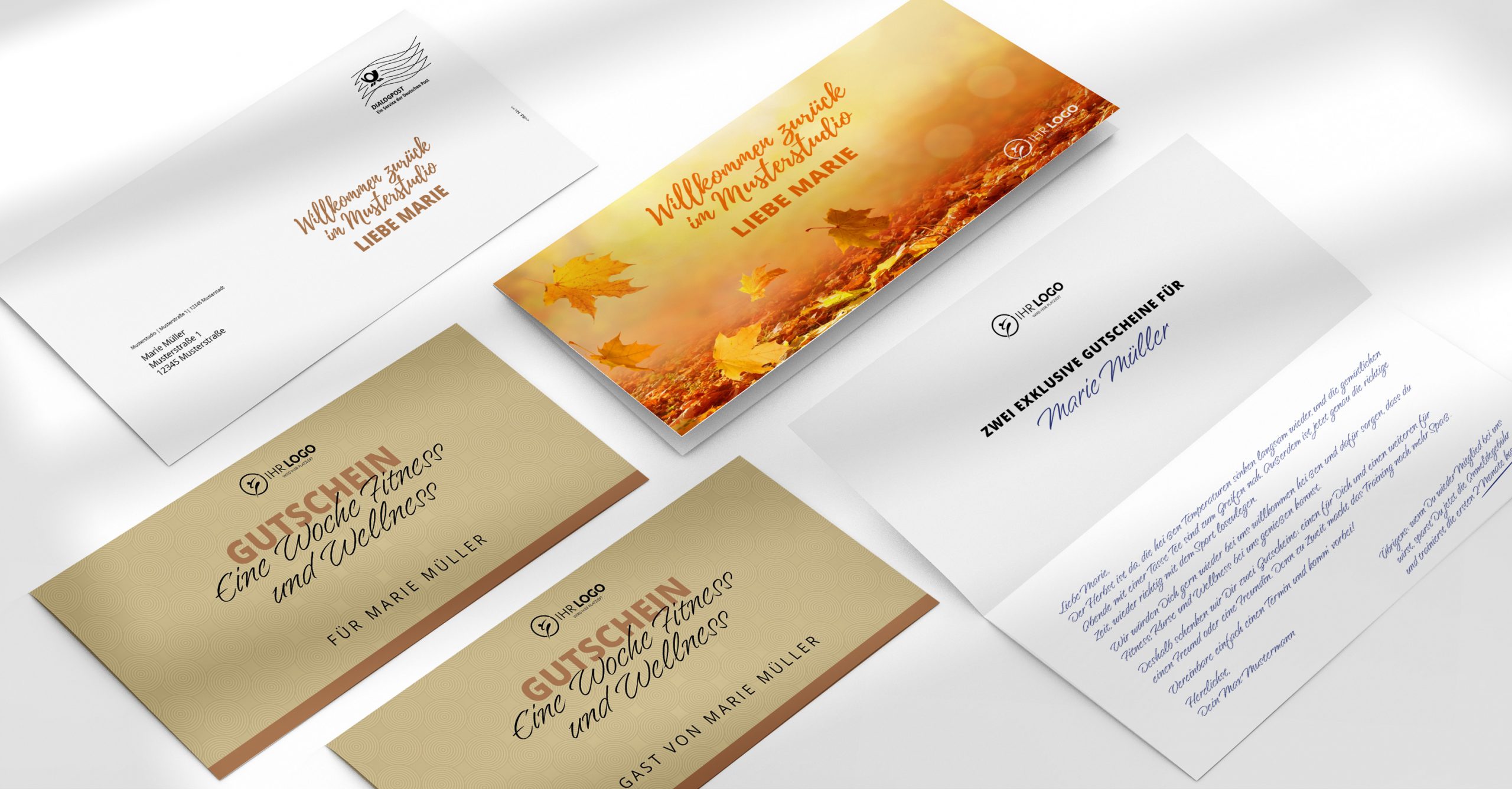 Der herbstlich gestalteten Brief-Klappkarte liegen zwei Gutscheine bei. Mit dem ersten Gutschein motivieren Sie das ehemalige Mitglied zu einem “Come Back” in Ihren Club.