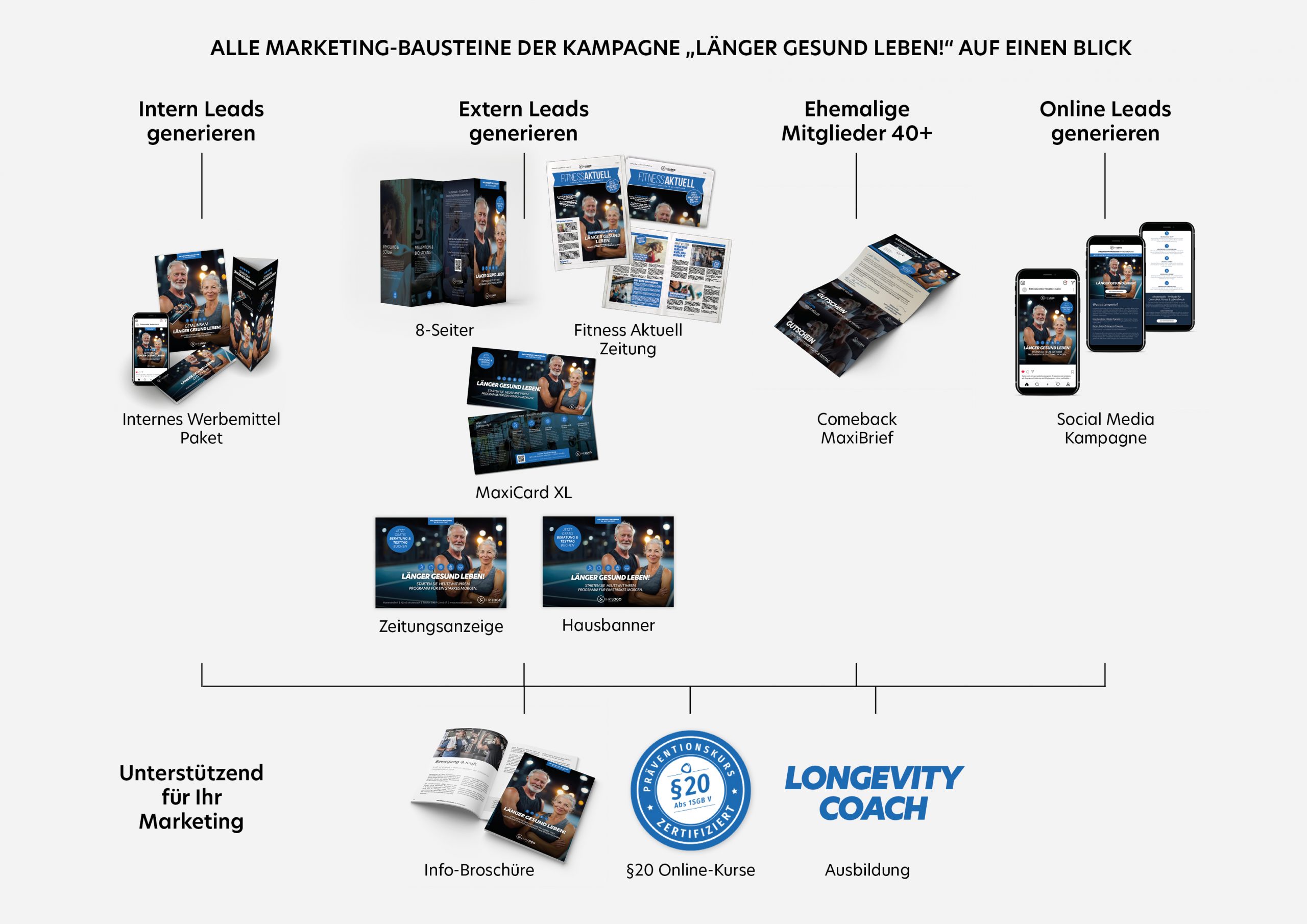 Das umfassende Marketing- und Werbepaket des Horn Verlags macht Ihre Mitglieder und Interessenten gezielt auf Ihr Longevity-Programm aufmerksam – intern wie extern. Es umfasst ein internes Werbemittelpaket zur Bewerbung im Studio, externe Werbemittel für Mitglieder und Neukunden, eine aufmerksamkeitsstarke Social-Media-Kampagne sowie ein Comeback-Mailing zur Rückgewinnung ehemaliger Mitglieder.