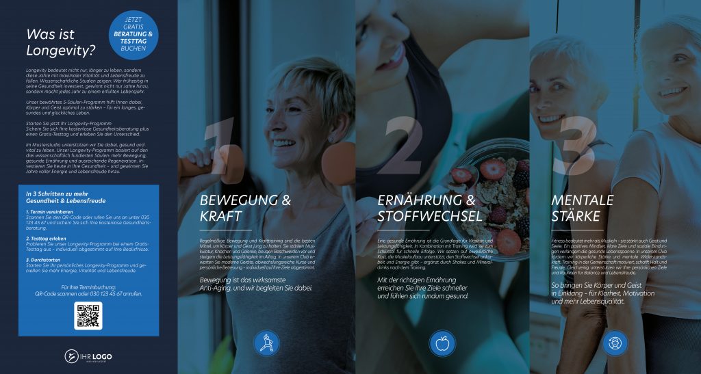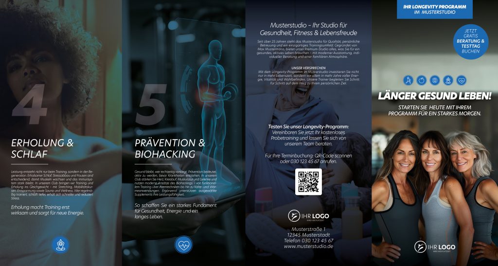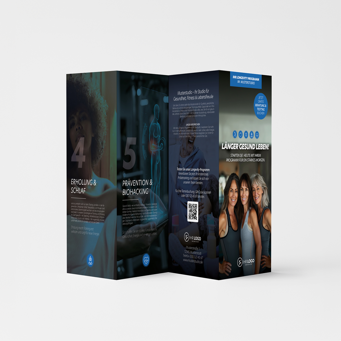 Die 8-seitige Wickelfalz-Broschüre „Länger gesund leben!“ im Format 14 × 29,7 cm bringt das Thema Gesundheit, Prävention und Lebensfreude direkt in die Haushalte Ihrer Zielgruppe. Sie wurde speziell für Fitnessstudios entwickelt, die ihr Angebot im Bereich Vitalität, Anti-Aging und ganzheitliche Gesundheit professionell präsentieren möchten.