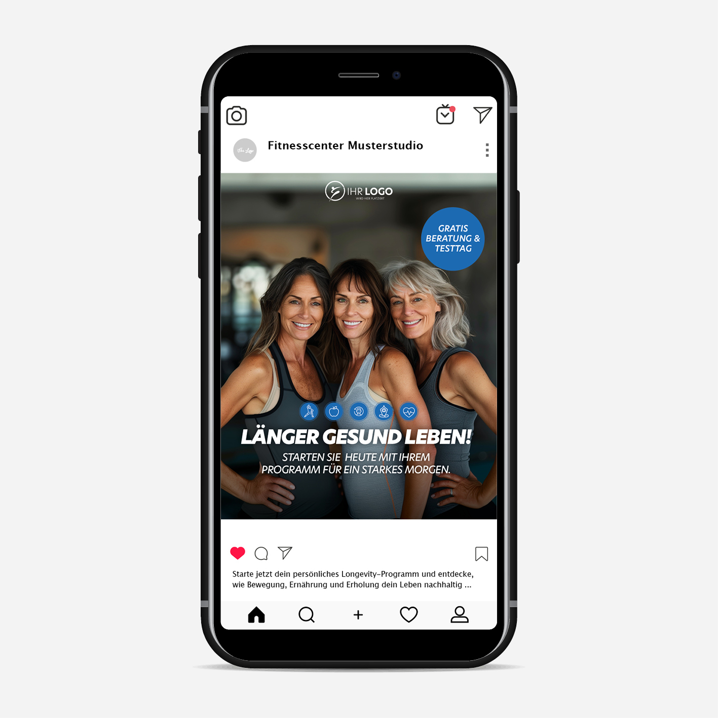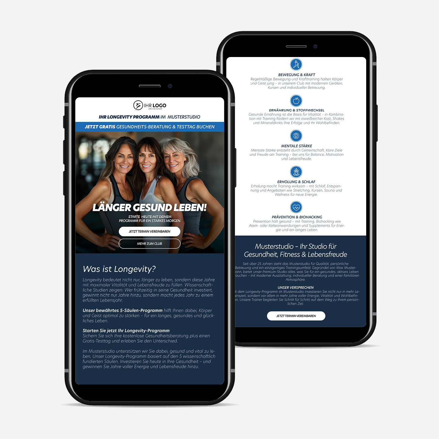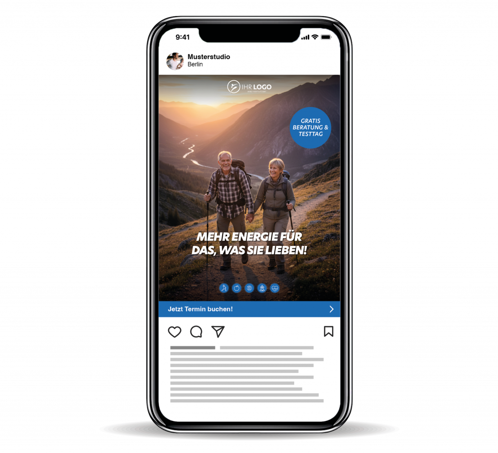 Mit den Social Media Paketen zur Longevity-Kampagne „Länger gesund leben” gewinnen Sie gezielt neue Interessenten für Ihr Studio. Die Pakete enthalten alles, was Sie für eine professionelle Online-Kampagne brauchen: aufmerksamkeitsstarke Bild- und Video-Ads, organische Posts, eine optimierte Landingpage zur Lead-Erfassung und ein Webbanner für Ihre Website oder Newsletter.
