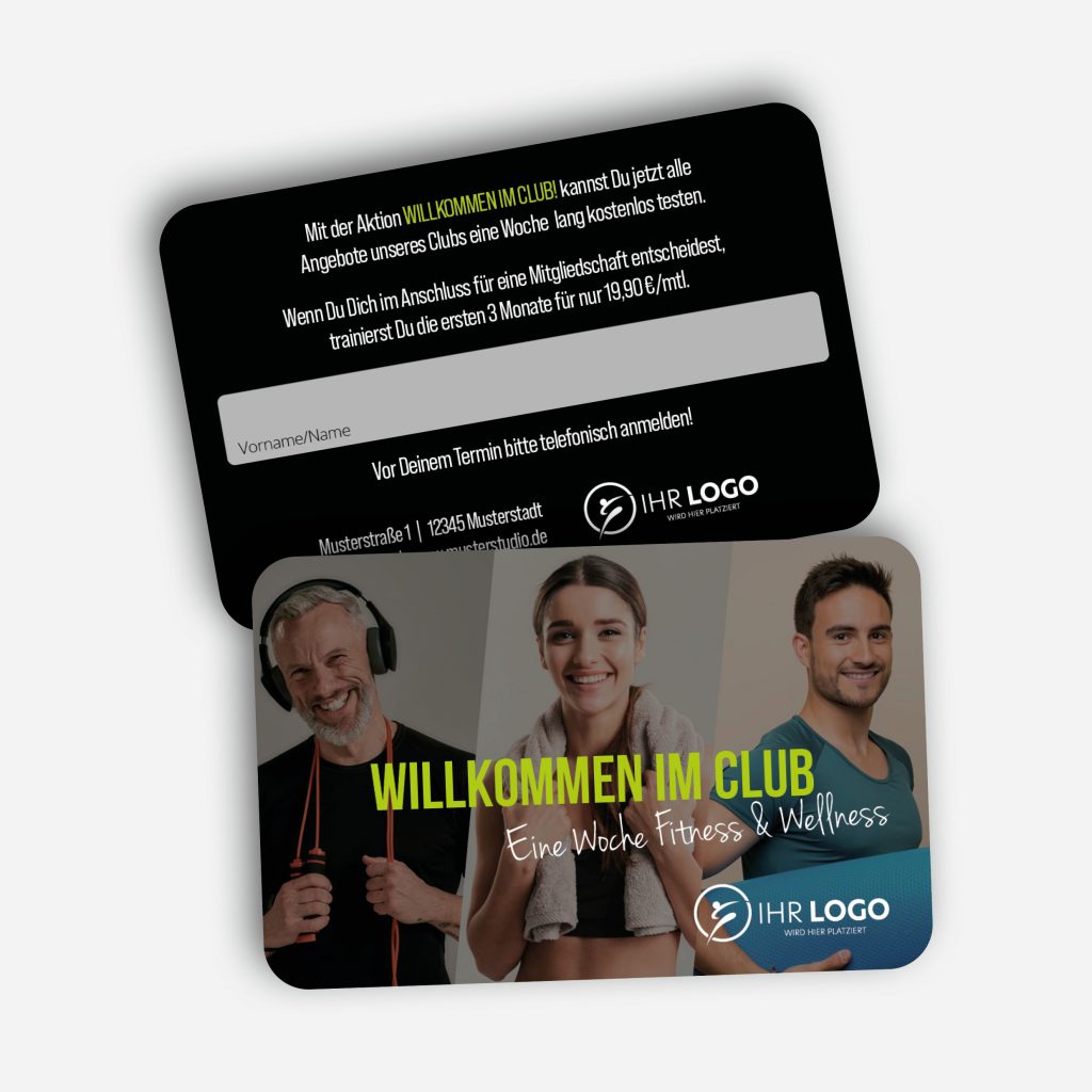 Die Scheckkarten werden von Ihren Mitgliedern an Freunde und Familie weitergegeben. Mit der Karte kann der Gast einen Tag, eine Woche oder einen Monat kostenlos Ihren Club testen. Die Inhalte der Karte bestimmen Sie.
