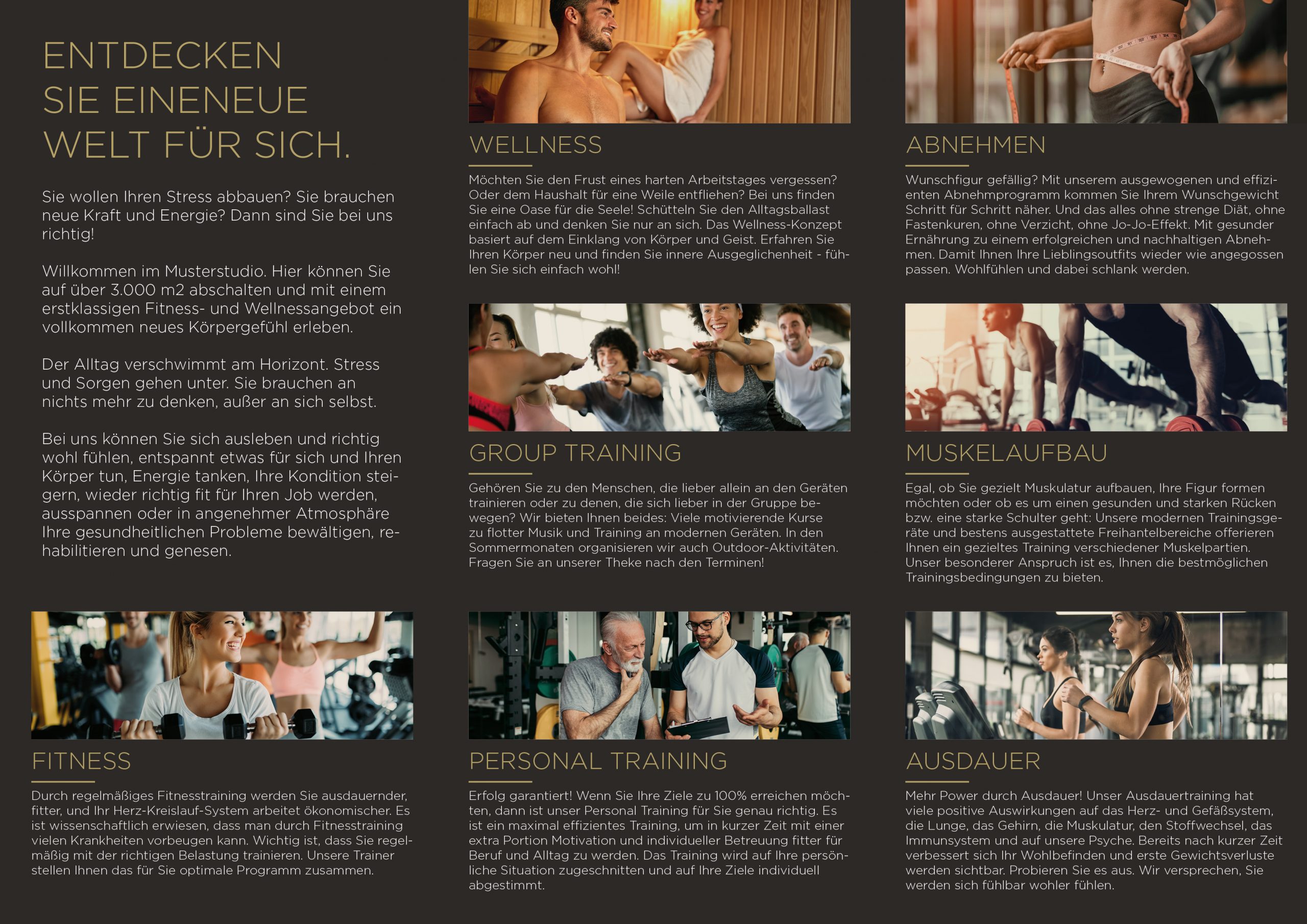 Die Farben werden ohne Aufpreis an Ihre Corporate Design Farben angepasst. Alle Texte und Bilder können nach Ihren Vorstellungen geändert werden. Gerne verwenden wir beim Layout auch Bilder von Ihrem Studio. So erhalten Sie am Ende Ihre ganz individuelle Imagebroschüre.