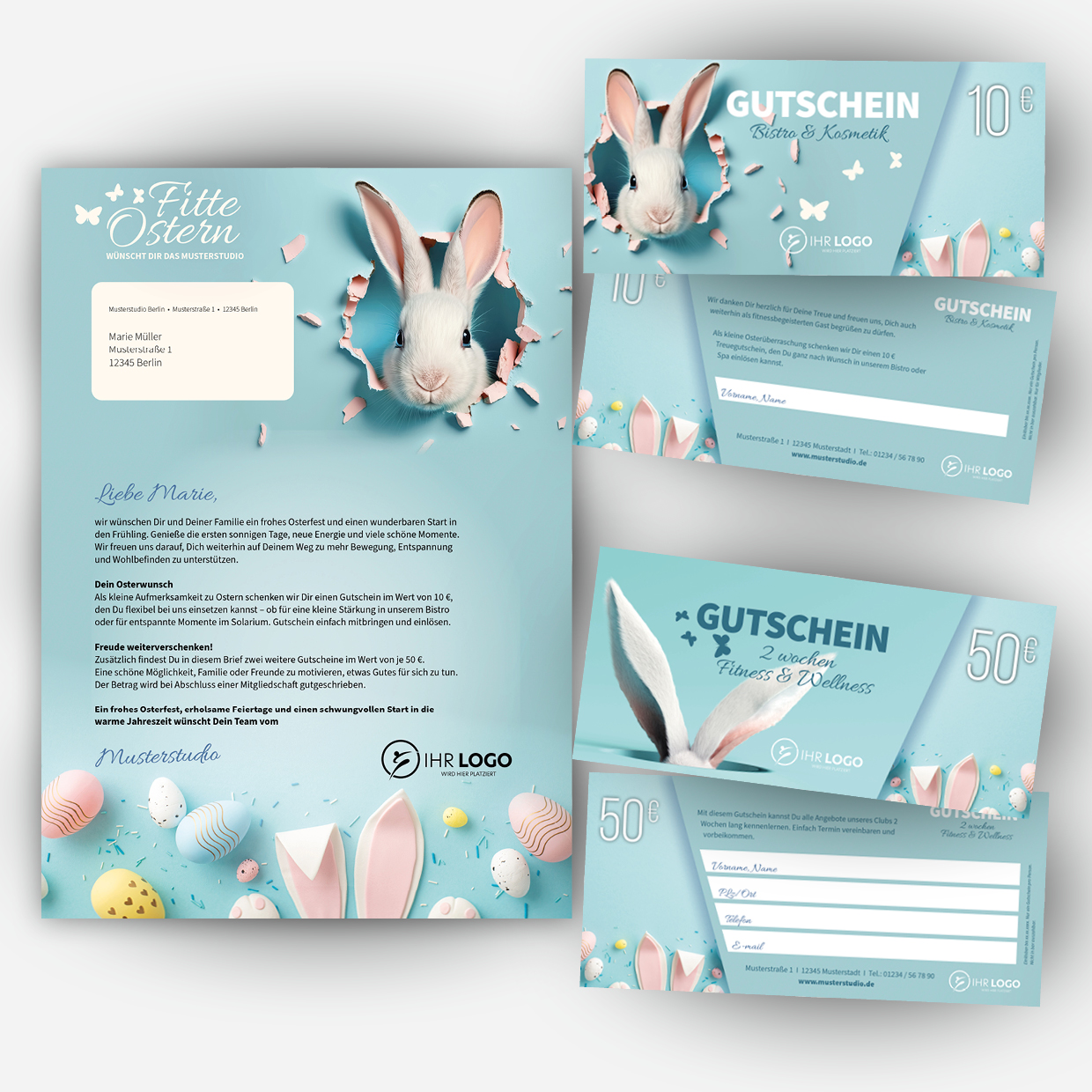 Der Osterbrief im DIN-A4-Format ist eine sympathische Möglichkeit, Ihren Mitgliedern frohe Ostern zu wünschen, sich für ihre Treue zu bedanken und gleichzeitig neue Interessenten für Ihren Club zu gewinnen. Durch den persönlichen Brieftext und die beiliegenden Gutscheine entsteht ein hochwertiger Eindruck, der Wertschätzung vermittelt und zum Handeln motiviert.
