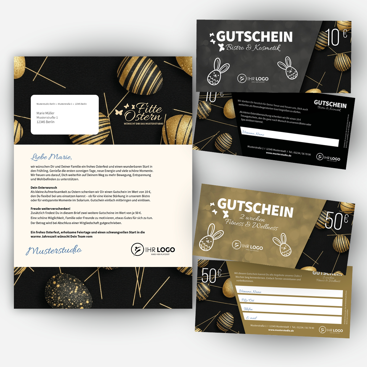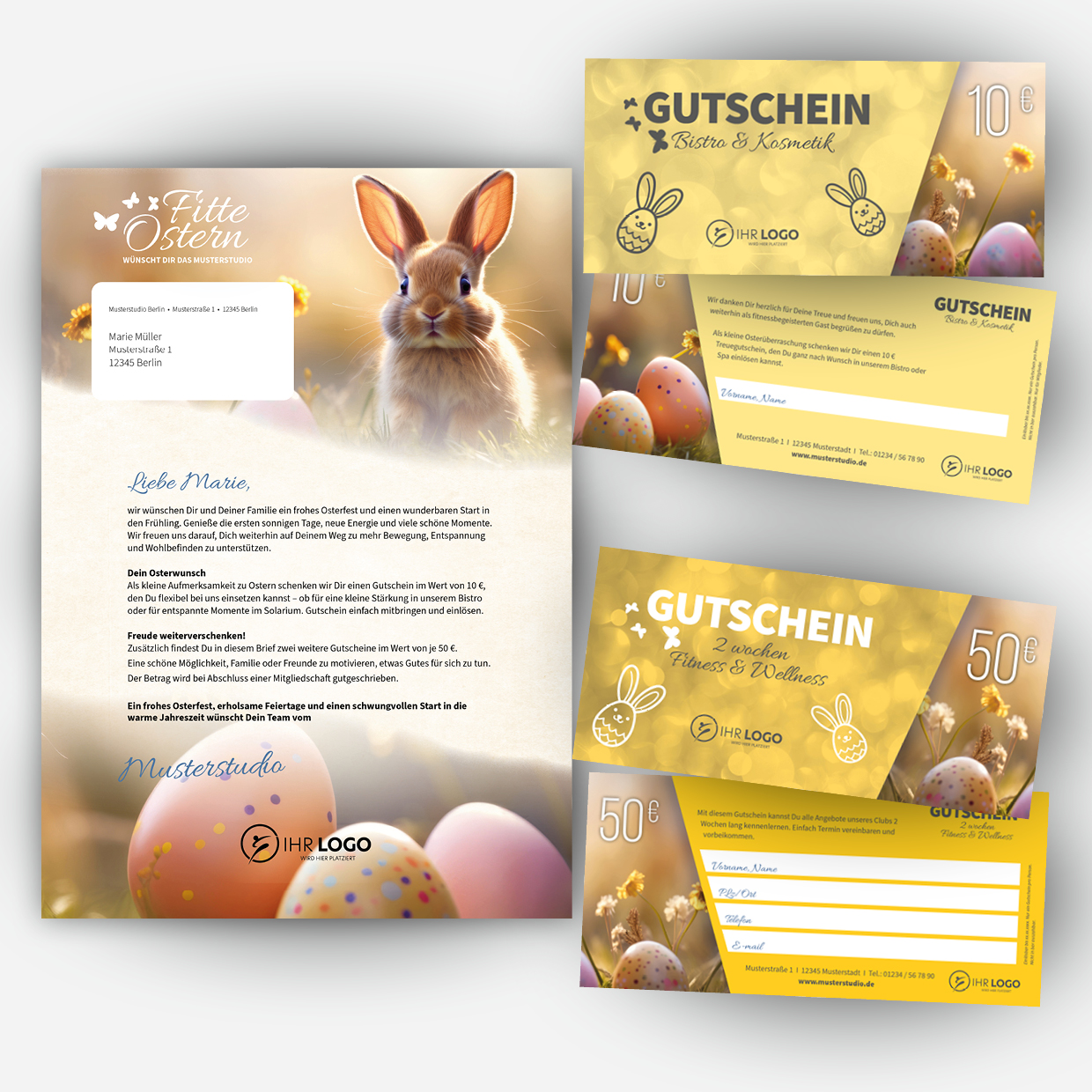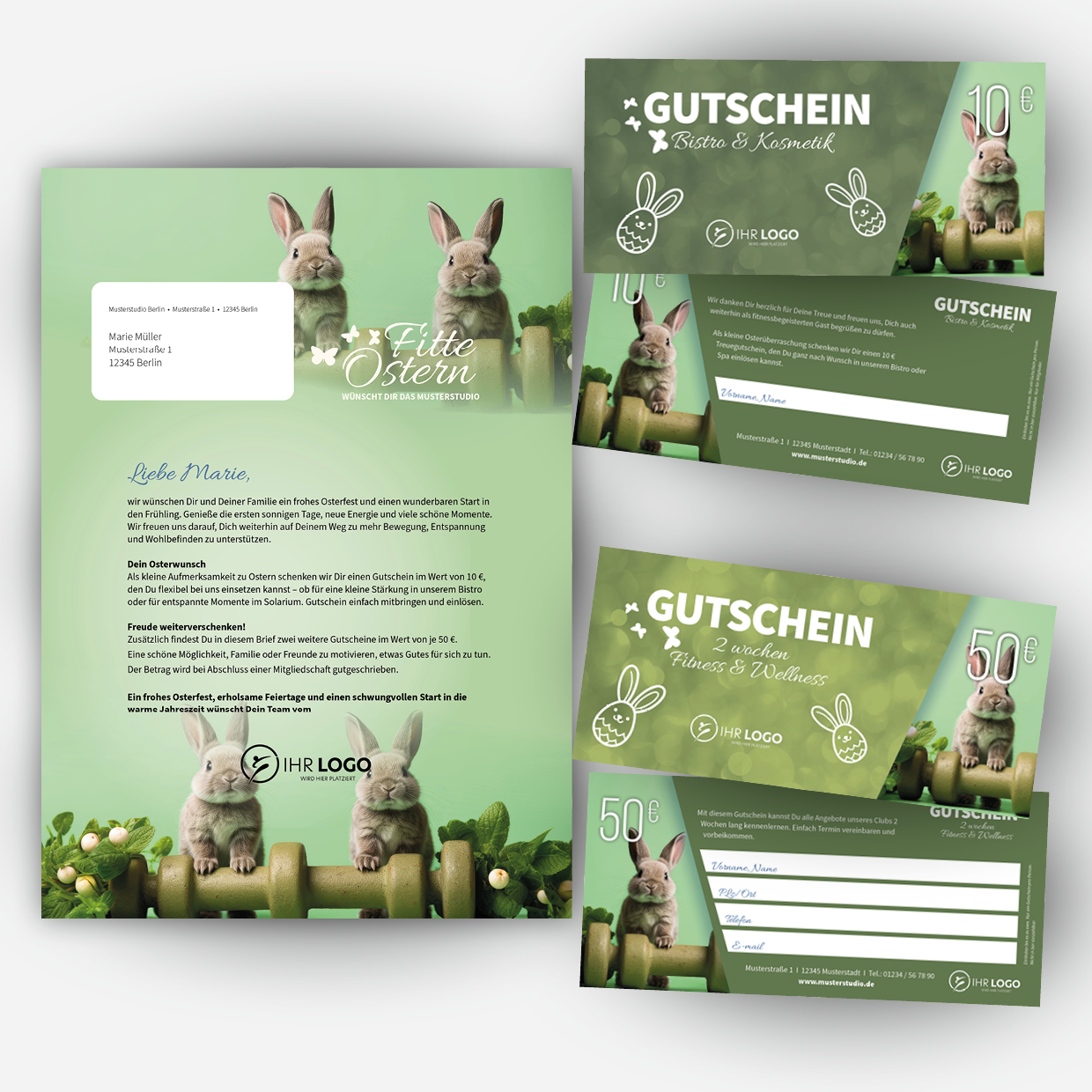Im Brief enthalten sind drei separate Gutscheine im DIN-lang-Format. Mit dem ersten Gutschein machen Sie Ihrem Mitglied eine kleine Osterfreude, zum Beispiel in Form eines 10,- € Bistroguthabens, einer Wellnessleistung oder einer anderen Aufmerksamkeit in Ihrem Club. Zwei weitere Gutscheine werden vom Mitglied an Freunde oder Familienangehörige weitergegeben und laden diese ein, Ihren Club unverbindlich kennenzulernen. So entstehen zusätzliche Kontakte, aus denen mit dem passenden Angebot neue Mitglieder werden können.