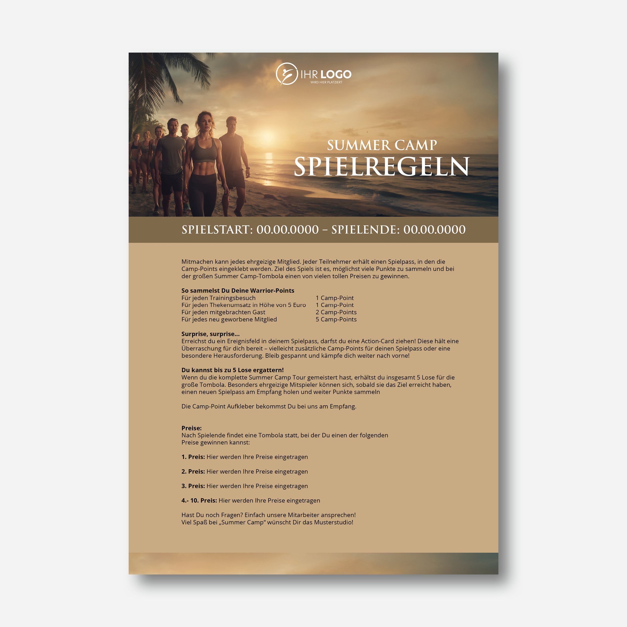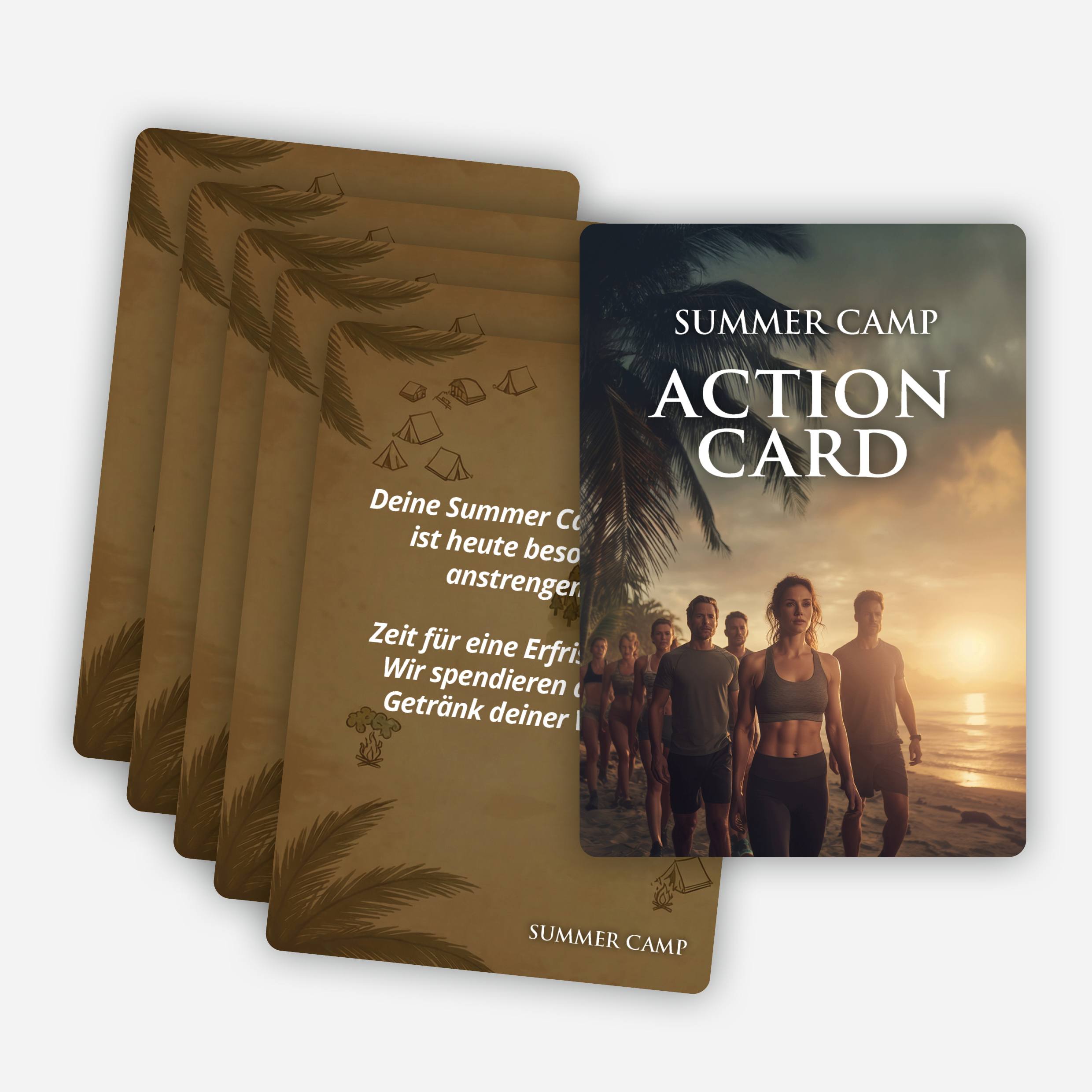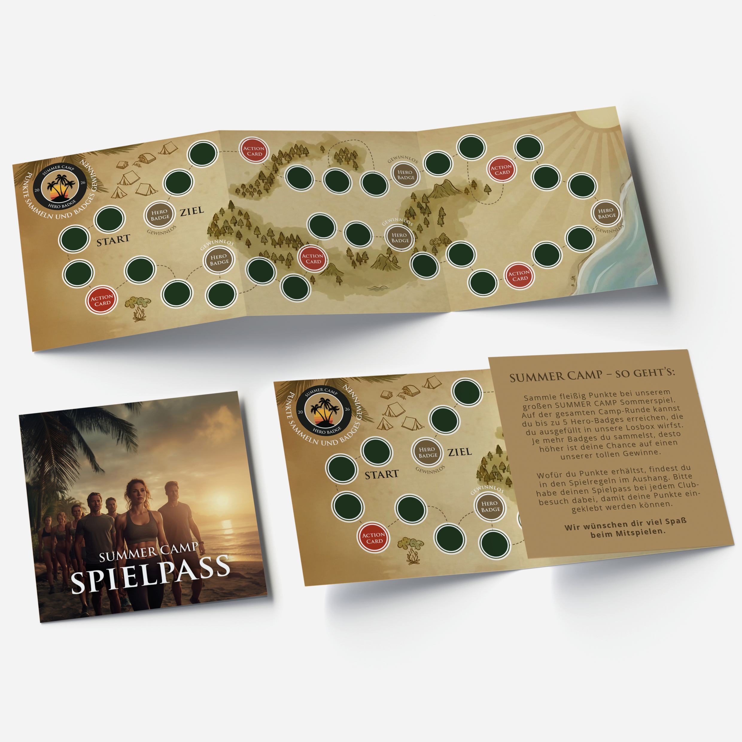 Mit SUMMER CAMP verwandeln Sie Ihren Fitnessclub in ein erlebnisreiches Sommerspiel, das Ihre Mitglieder aktiv hält und gleichzeitig neue Interessenten anzieht. Jeder Teilnehmer erhält einen Spielpass mit 55 Camp-Stationen und sammelt Camp-Points durch Trainingsbesuche sowie das Mitbringen von Gästen. Die Camp-Points werden in den Spielpass eingeklebt. Wird ein Gast Mitglied, gibt es zusätzliche Camp-Points.